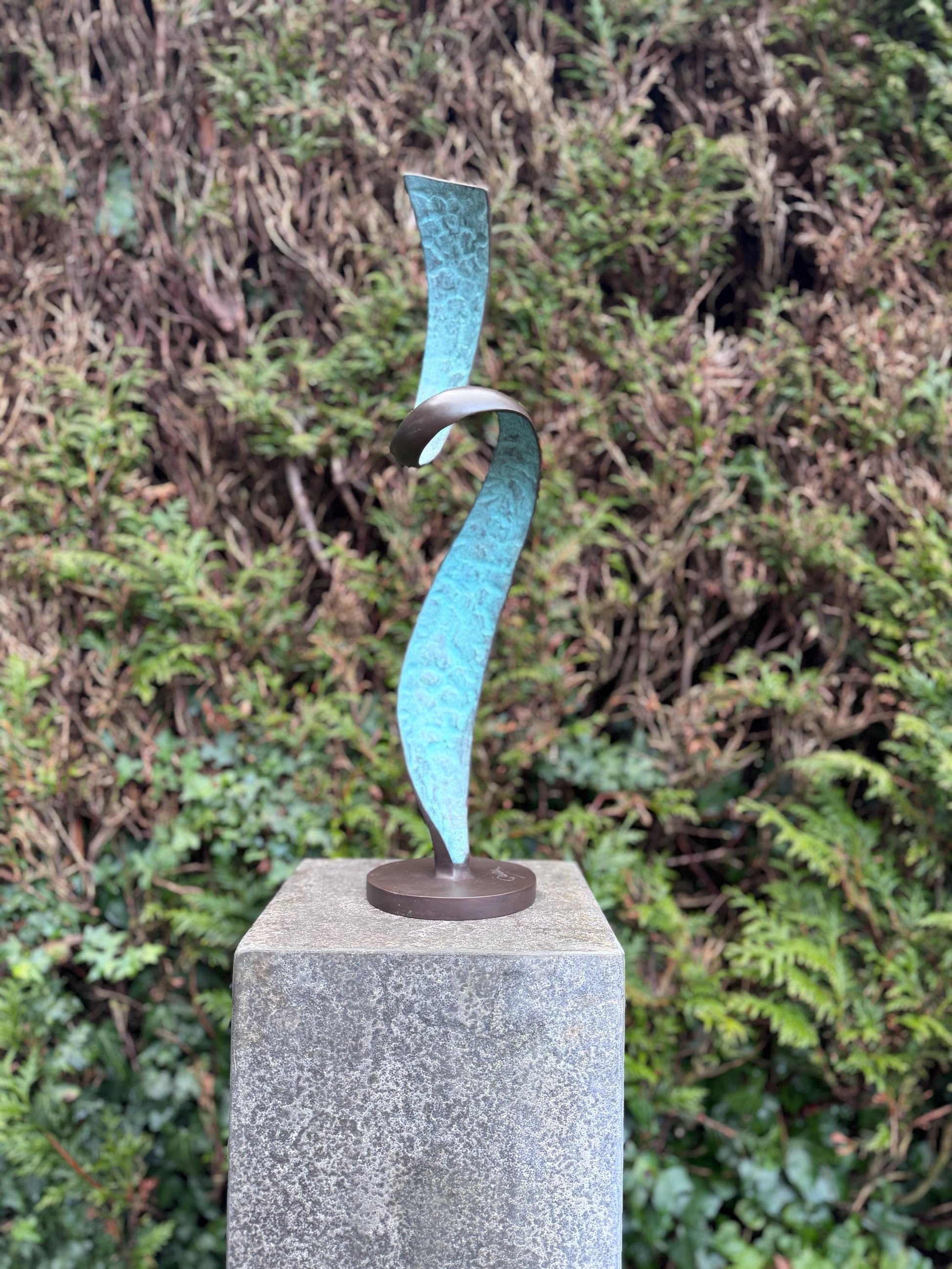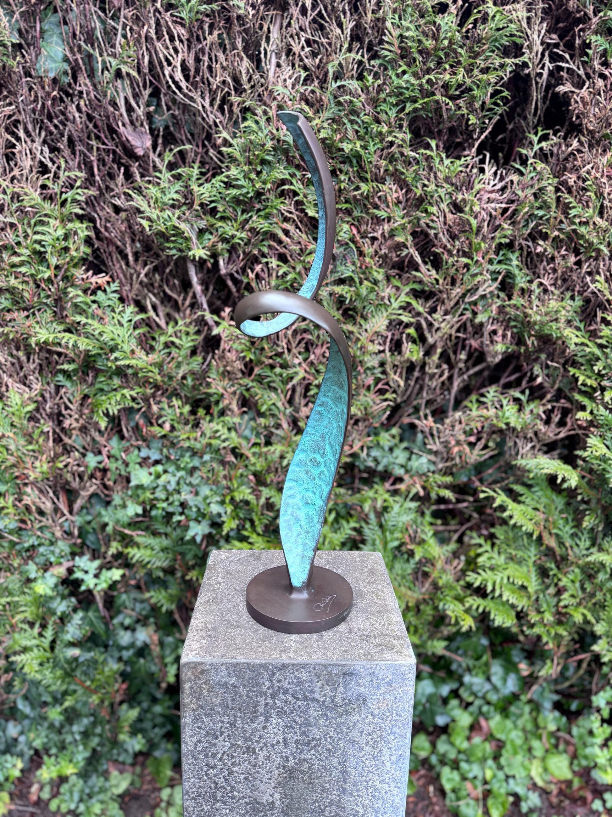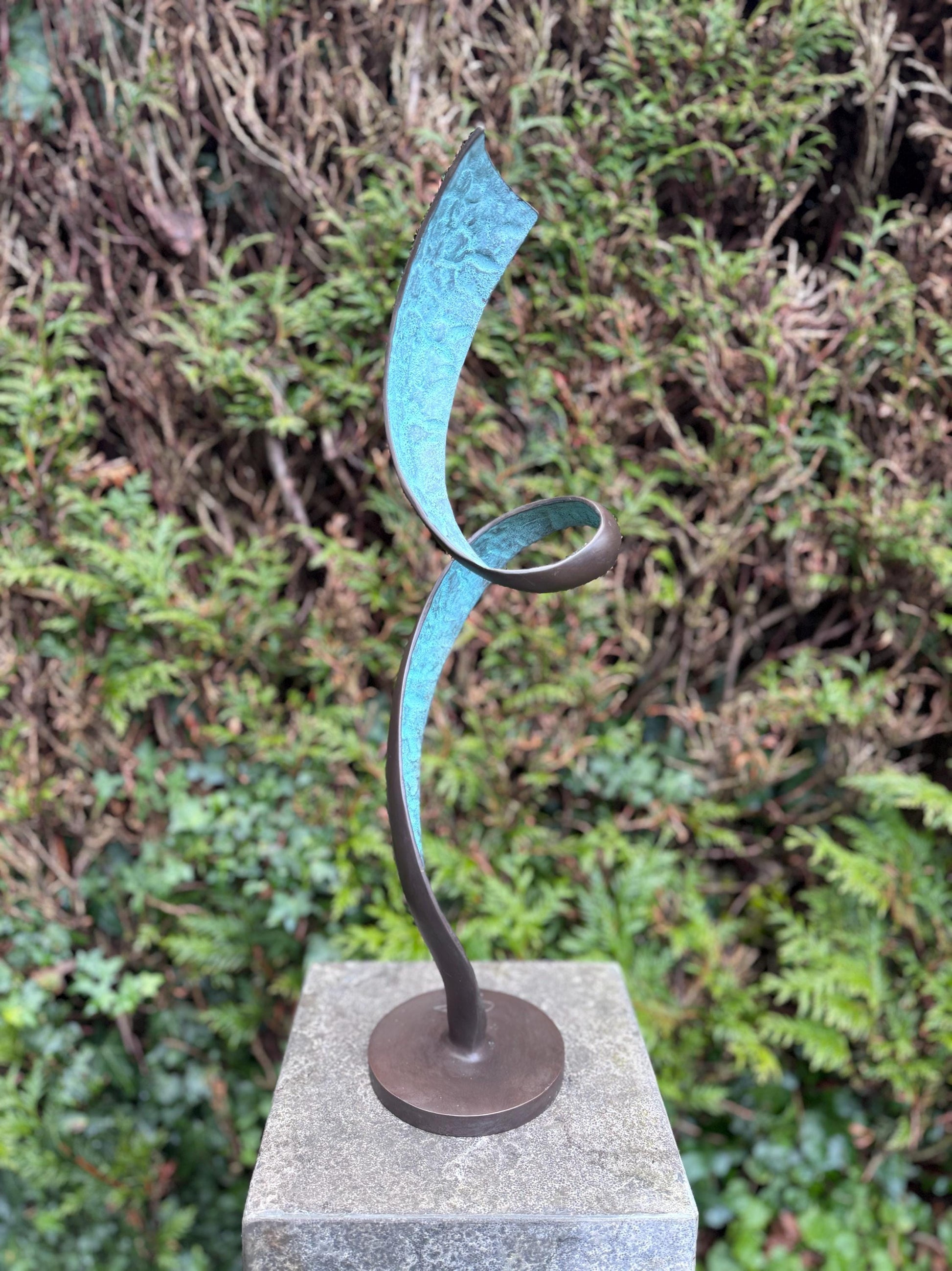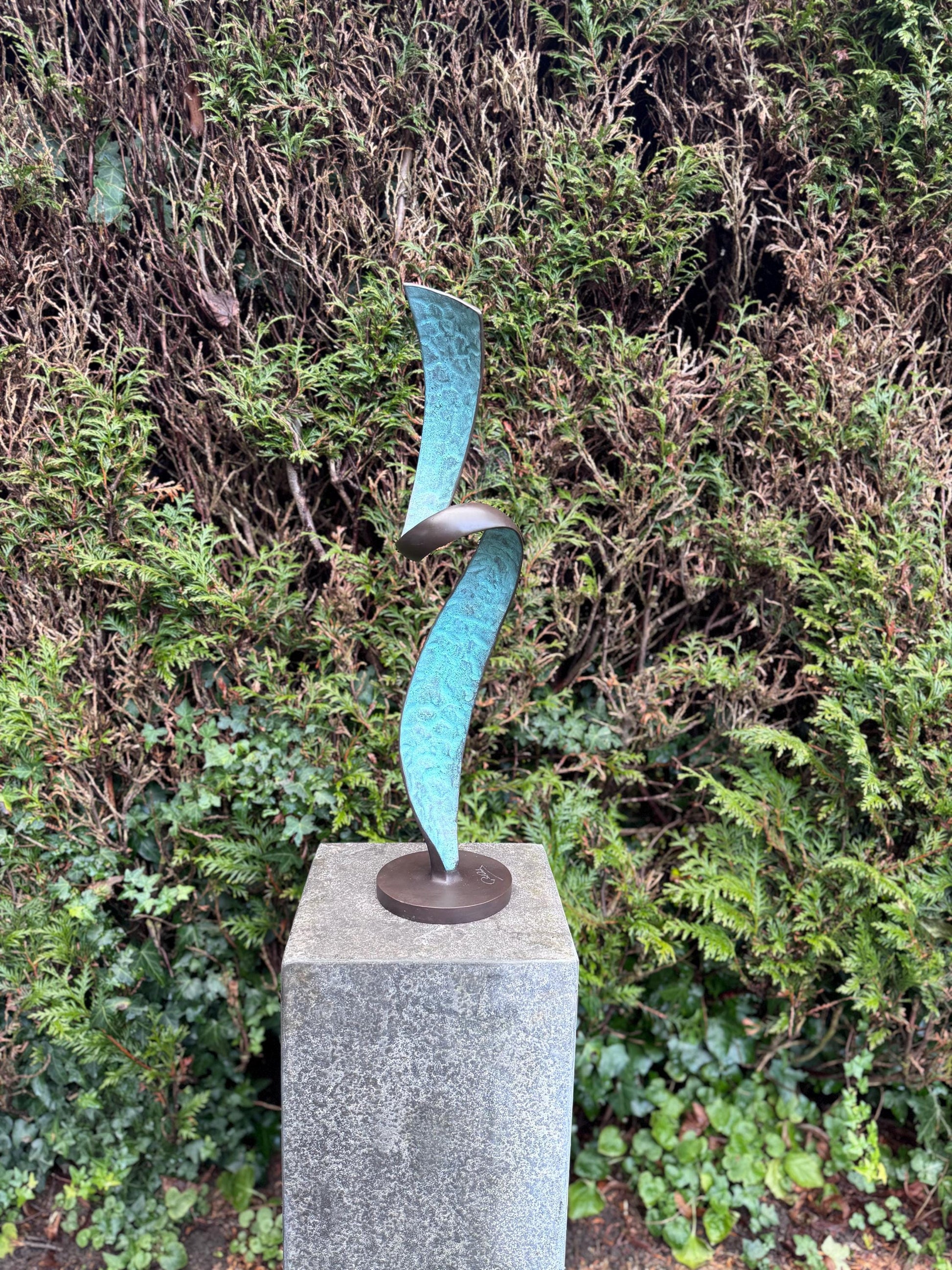 This elegant abstract bronze sculpture captures the essence of movement in a flowing, spiral form. The upward sweep of the twisted structure evokes a sense of growth and energy, while the textured green-blue patina contrasts beautifully with the darker bronze base. Minimalist yet expressive, this piece is a celebration of balance, fluidity, and modern artistic form. It creates a sophisticated focal point in both contemporary gardens and interior spaces.