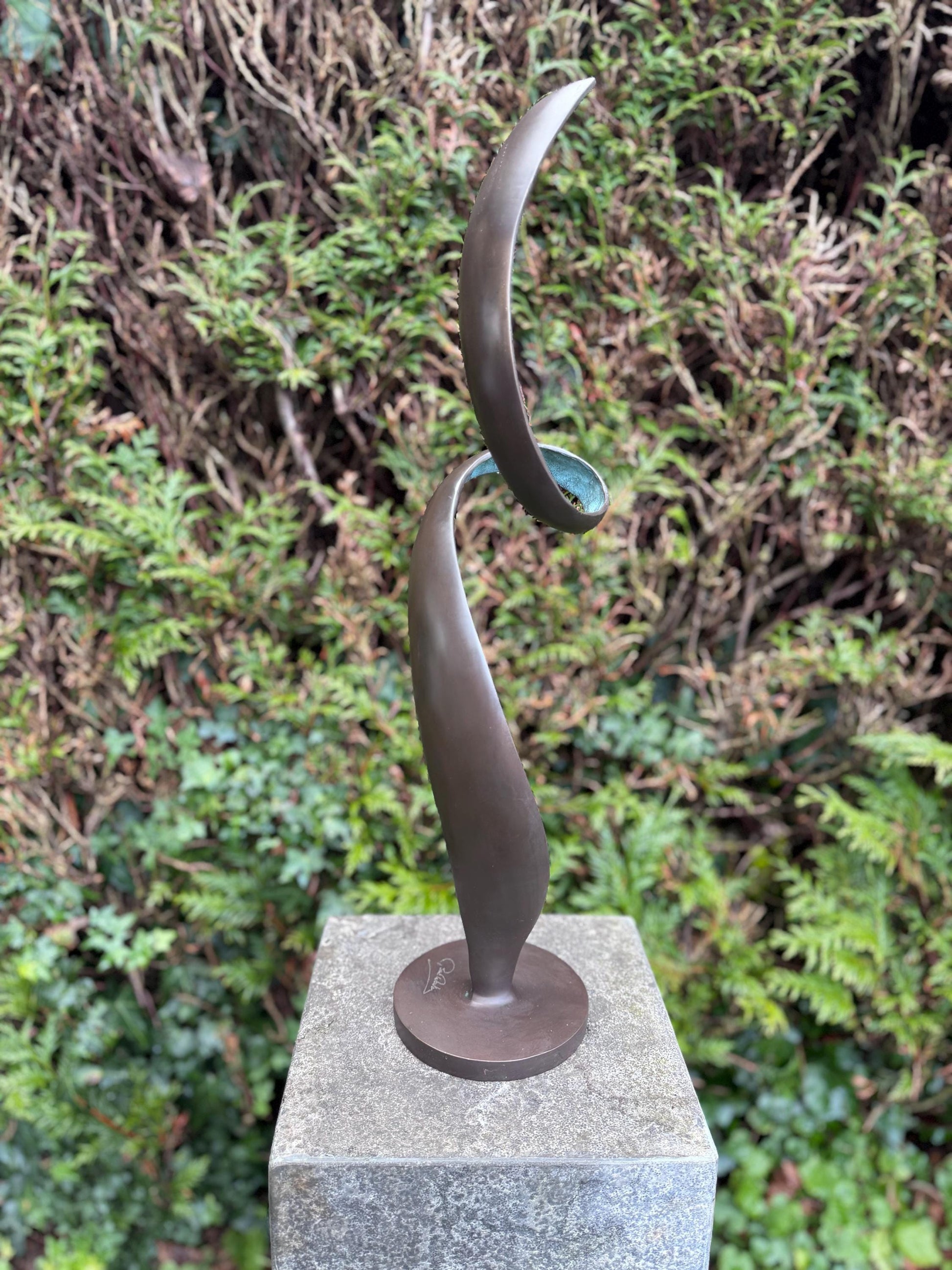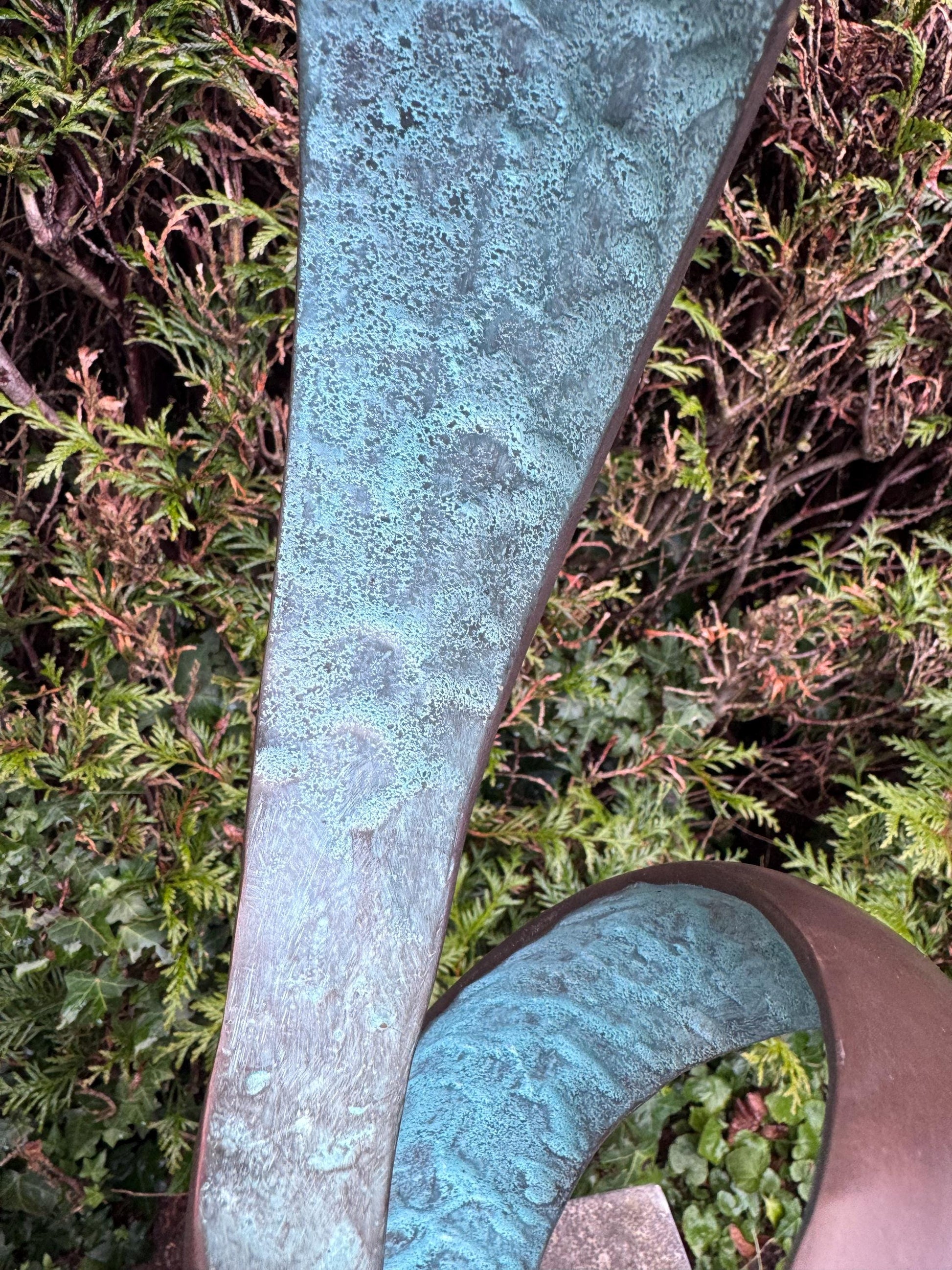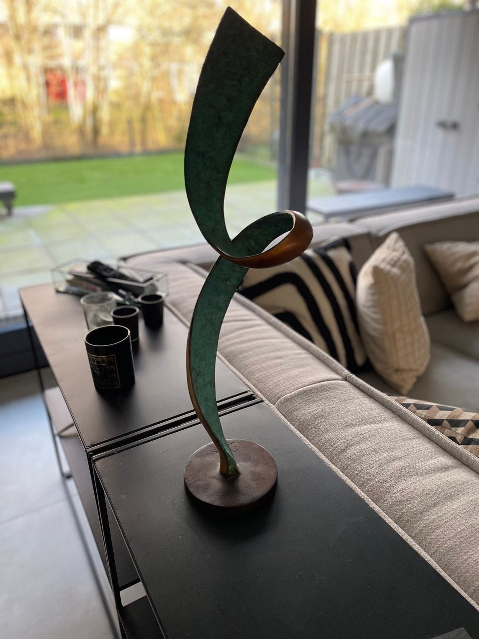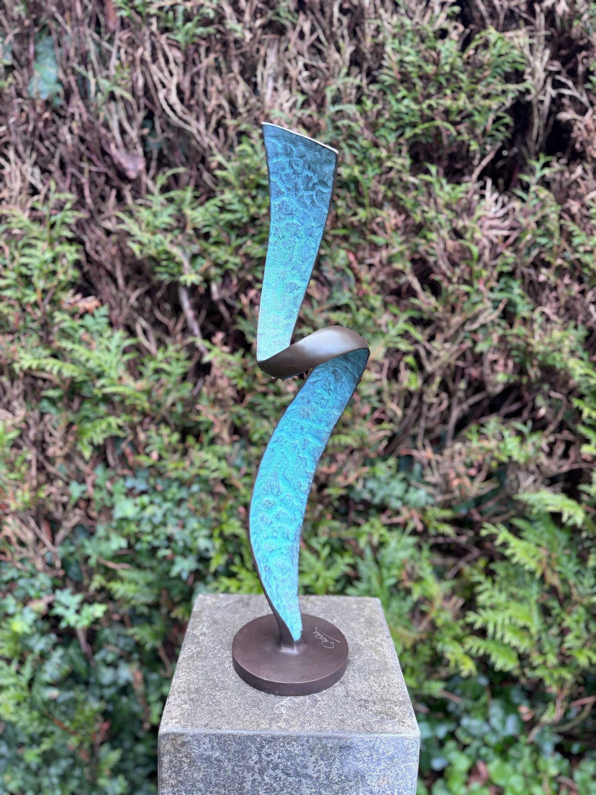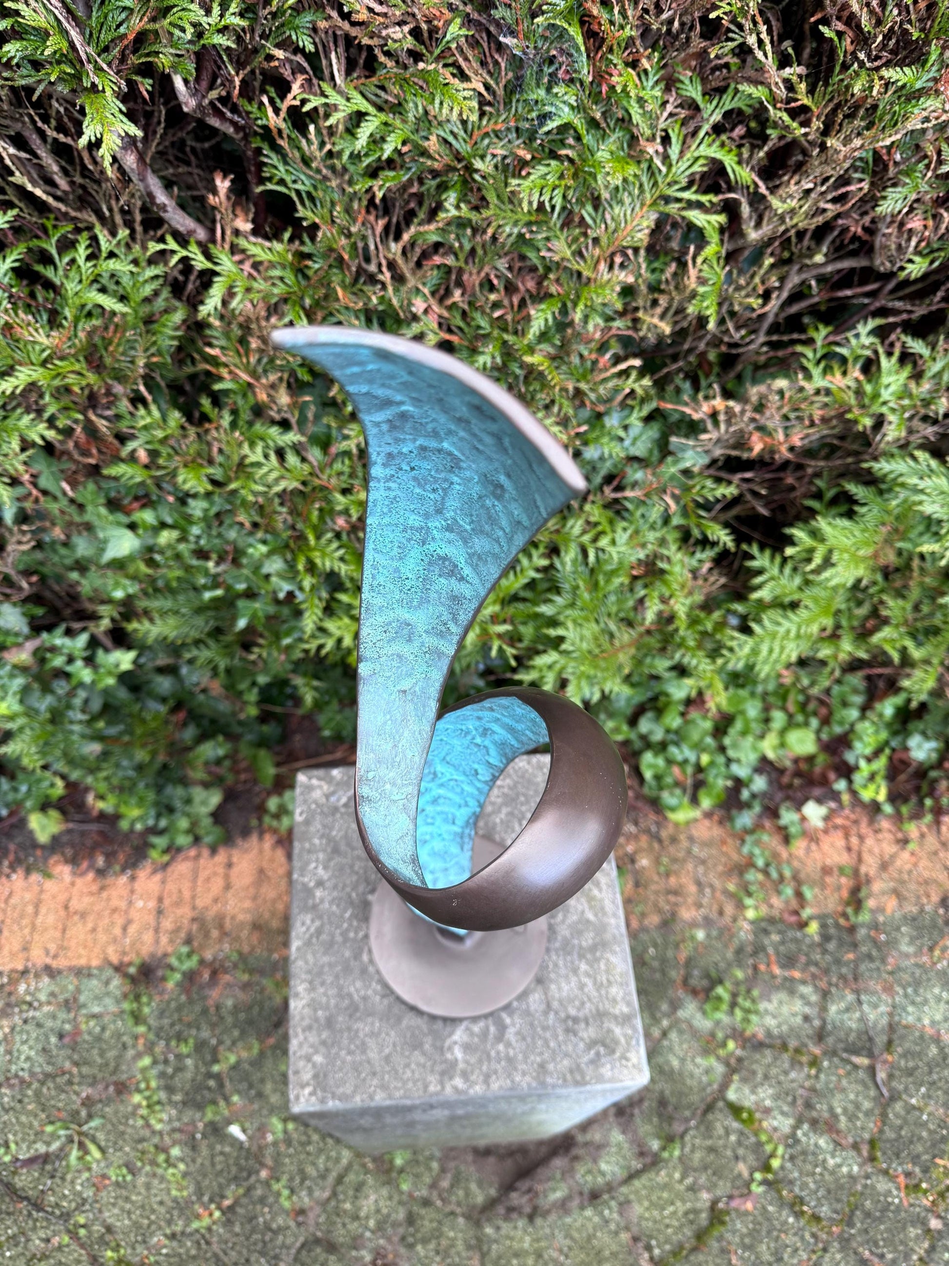 This elegant abstract bronze sculpture captures the essence of movement in a flowing, spiral form. The upward sweep of the twisted structure evokes a sense of growth and energy, while the textured green-blue patina contrasts beautifully with the darker bronze base. Minimalist yet expressive, this piece is a celebration of balance, fluidity, and modern artistic form. It creates a sophisticated focal point in both contemporary gardens and interior spaces.
